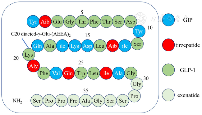 注:不同的顏色表示每個殘基的來源;GIP=葡萄糖依賴性促胰島素多肽,tirzepatide=替西帕肽,GLP-1=胰高糖素樣肽-1,exenatide=艾塞那肽