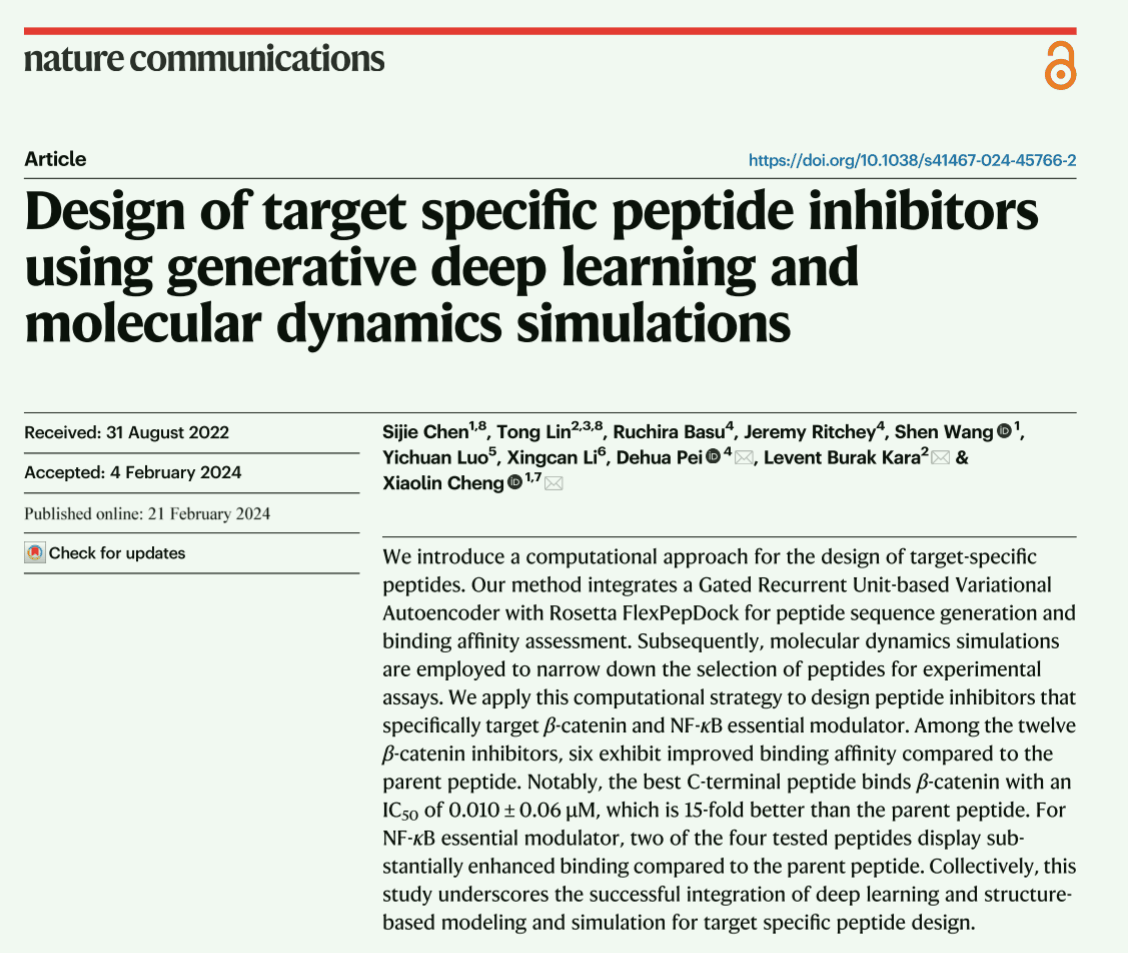 論文提出了一種針對特定靶點的肽類抑制劑的計算方法。該方法結(jié)合了基于門控循環(huán)單元的變分自編碼器和Rosetta FlexPepDock用于肽序列生成及結(jié)合親和力評估,隨后通過分子動力學(xué)模擬來縮小實驗檢測肽類的選擇范圍。研究旨在設(shè)計特定針對β-catenin和NF-κB基本調(diào)節(jié)子的肽類抑制劑。