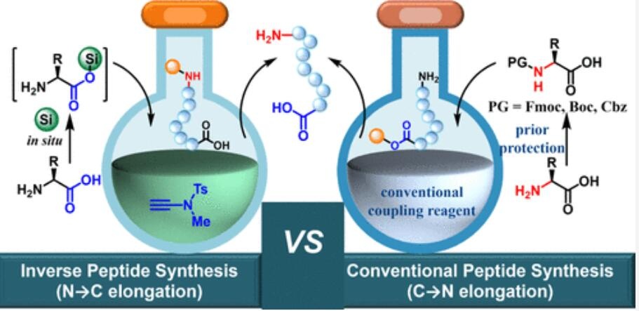 提出使用未保護(hù)氨基酸的反向肽化學(xué)合成作為理想策略,但60多年來由于嚴(yán)重的外消旋/表里異構(gòu)化問題而未能成功。