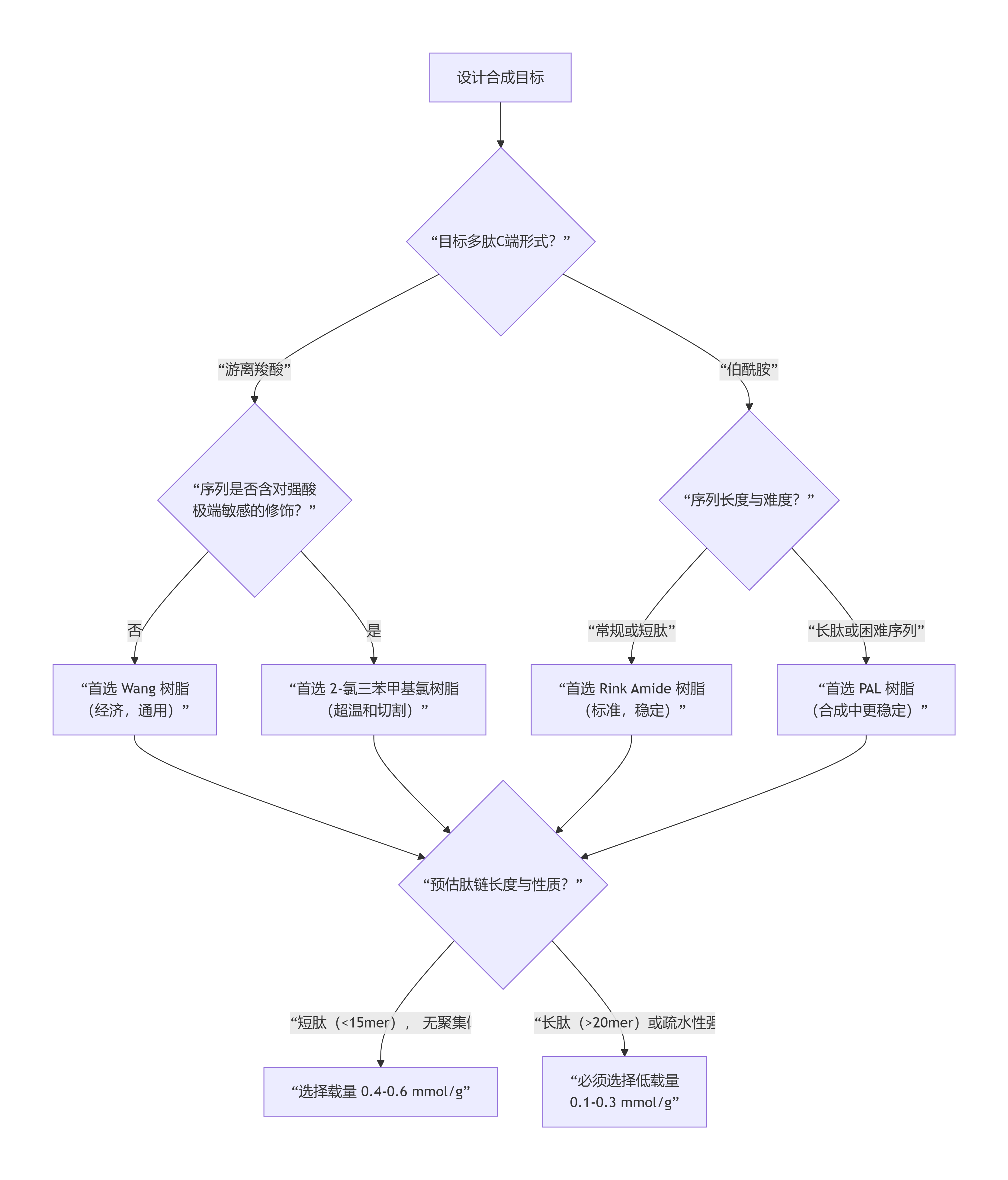 選擇原則:對(duì)于常規(guī)短肽,可選擇0.4-0.6 mmol/g。對(duì)于超過20個(gè)殘基的長(zhǎng)肽或富含Val, Ile, Tyr等易聚集氨基酸的序列,強(qiáng)烈建議使用0.1-0.25 mmol/g的低載量樹脂。