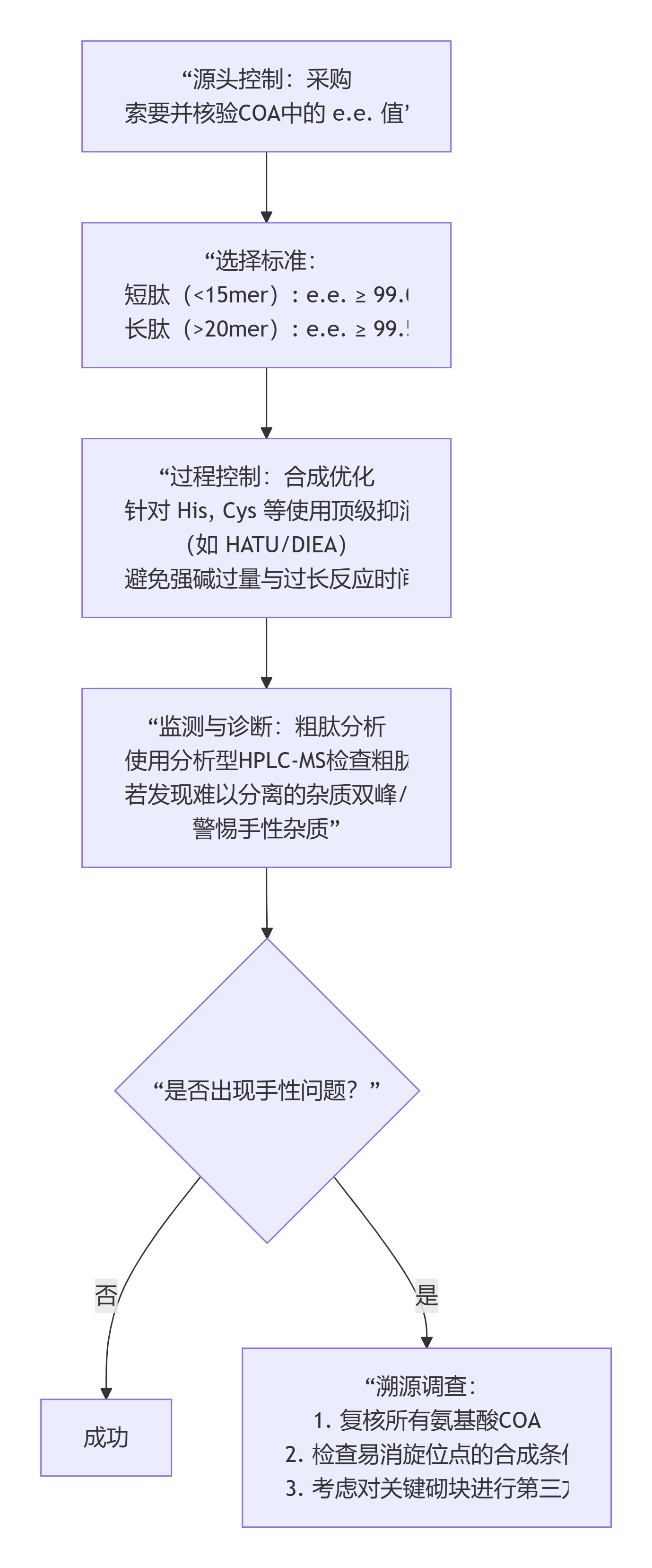 故障排查時(shí):當(dāng)最終粗肽出現(xiàn)無法解釋的復(fù)雜雜質(zhì)譜時(shí),手性污染應(yīng)作為首要懷疑對象之一進(jìn)行排查。