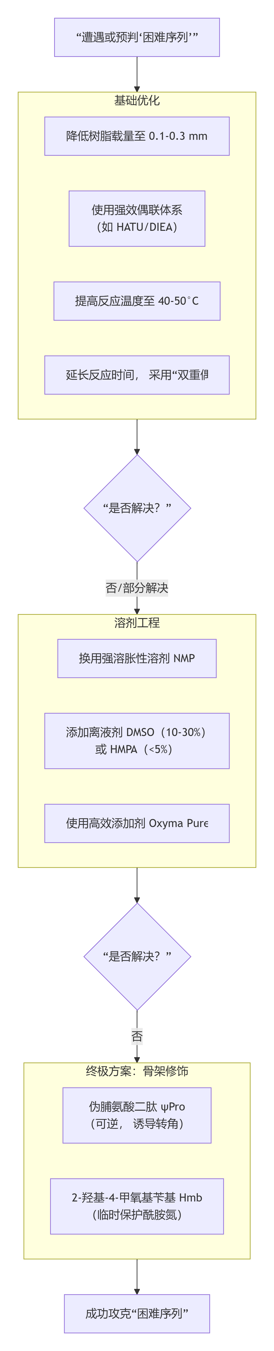 在固相多肽合成中,“困難序列”現(xiàn)象如同一道無形的墻,當(dāng)合成進(jìn)行到特定長度(通常15-20個(gè)殘基)或富含特定氨基酸模式時(shí),偶聯(lián)與脫保護(hù)效率會突然崩潰。這并非偶然失敗,而是由肽鏈內(nèi)在的物理化學(xué)性質(zhì)決定的必然挑戰(zhàn)。本文將系統(tǒng)性地解構(gòu)“困難序列”的形成機(jī)理——以鏈間β-折疊聚集為核心,并提供一套從基礎(chǔ)優(yōu)化到“化學(xué)手術(shù)”的逐級遞進(jìn)的完整解決方案庫,重點(diǎn)闡釋 偽脯氨酸 與 Hmb 等骨架臨時(shí)保護(hù)基如何作為終極手段,通過重塑肽鏈性質(zhì)來攻克這一合成頑疾。