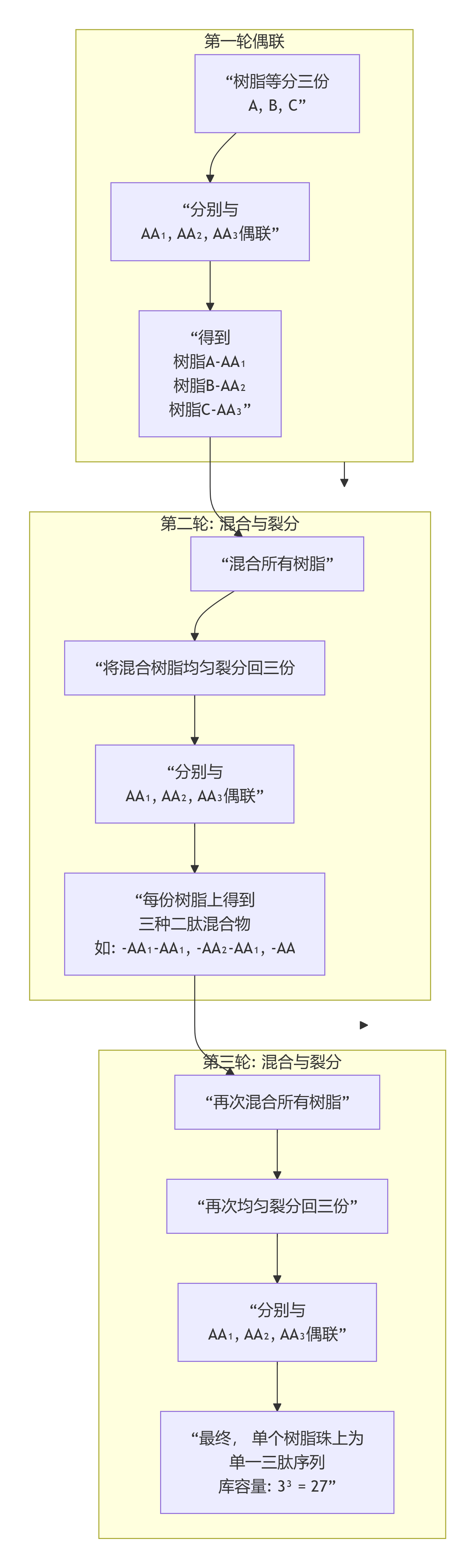 • “一珠一化合物”:經(jīng)過多輪混合與裂分后,單個樹脂珠上只攜帶一種肽序列,因?yàn)樵撝樽釉诿恳惠喠逊种兄槐环峙涞揭环N氨基酸。